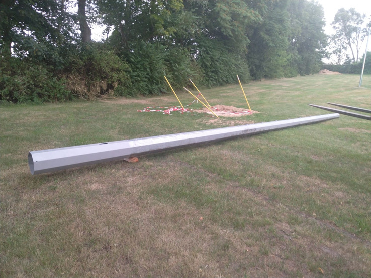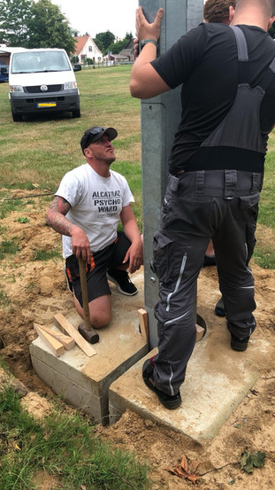 Am 19.08 ging es in die nächste Runde. Mit Hilfe eines Kranes wurden die verbleibenden 8m Stücken der Masten aufgesetzt. Früh aufstehen war gefragt, denn bereits um 07:00 Uhr kam der benötigte Kran um sein Werk zu tun. Am Vorabend wurden die Masten bereits durch fleißige Mitglieder vormontiert, sodass nur noch die "Hochzeit" zwischen Ober- und Unterteil des Mastes stattfinden musste. Danke für die Hilfe, vor allem mit Technik und schwerem Gerät.