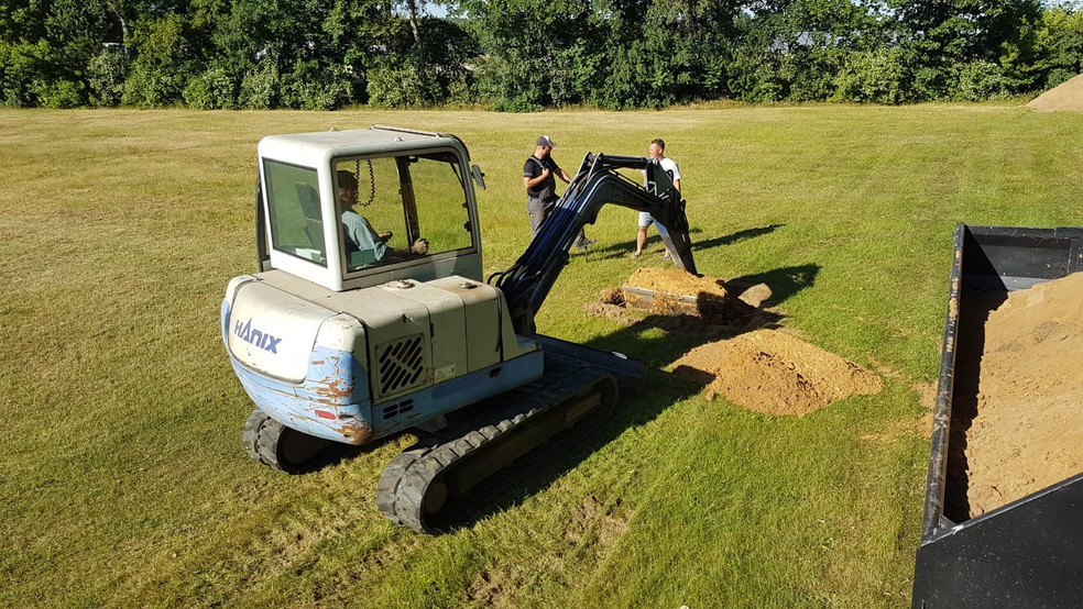 Am 27.06.2023 folgte der Nächste Schritt. Die Fundamente bzw. die Fundamentlöcher wurden verfüllt und eingeschlämmt. Hier war auch wieder Technik der FFW Tramm und eine helfende Hände am Start. Denn trotz Radlader musste hier im letzten Step auf die gute alte Schaufel zurückgegriffen werden. Aber was wäre eine Baustelle bei einem Sportverein ohne den Einsatz von Muskeln ?! Richtig, nichts!